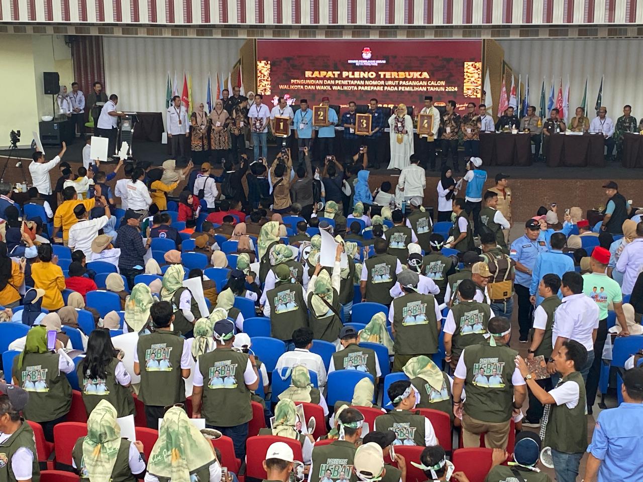 AKARBERITA.COM, Parepare – Dari hasil rapat pleno terbuka yang digelar Komisi Pemilihan Umum (KPU) Kota Parepare, terkait pengundian dan penetapan nomor urut paslon walikota dan wakil walikota, Auditorium IAIN Parepare, Senin (23/9/2024), menetapkan nomor urut keempat paslon.