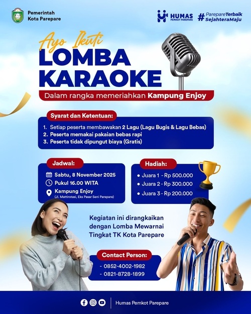 Selain lomba karaoke, kegiatan tersebut juga dirangkaikan dengan lomba mewarnai tingkat Taman Kanak-kanak (TK) se-Kota Parepare. Kehadiran dua kegiatan ini diharapkan menarik kunjungan masyarakat untuk beraktivitas di Kampung Enjoy, yang kini difokuskan sebagai ruang kreatif dan ekonomi baru bagi pelaku UMKM lokal.