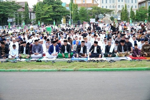 Wali Kota Parepare, Tasming Hamid dan Ketua Tim Penggerak PKK Parepare, dr. Andi Arfiah Tasming bersama jajaran Pemerintah Kota melaksanakan Salat Idul Adha berjamaah di Alun-Alun Kota, Lapangan Andi Makkasau.